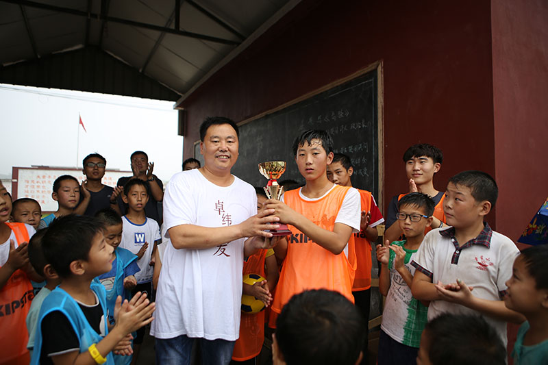 为孩子们颁发足球赛奖杯