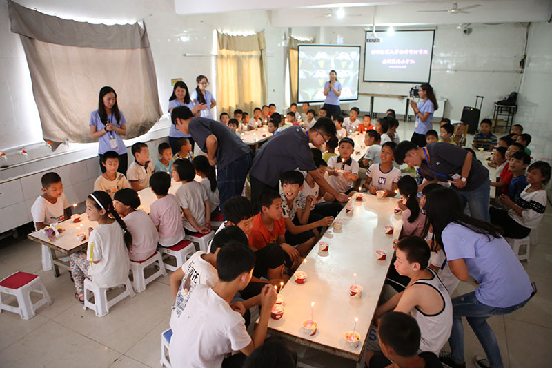 最后,院团委梁博宇老师为孩子们送上主题为“爱与被爱”的心灵分享课,带着孩子们走过一场爱意满满心灵旅程。她用游戏与点名的方式迅速使课堂步入正轨;通过讲故事阐述了“爱与被爱”的含义;通过视频播放让孩子们直观感受父母外出打工的现状,理解父母的艰辛和不在他们身边的缘由。在“打电话”的游戏环节中,当最后一名孩子传出“爸爸妈妈我爱你们”这句话的时候,所有的孩子的眼中都闪着思念的光。课上,小分队成员们还教会孩子们手语歌曲《感恩的心》,分享了蛋糕。